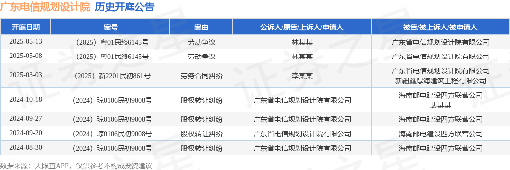 本站消息,根据天眼查APP显示,近日公布了一则广东省电信规划设计院有限公司作为被告/被上诉人的开庭公告,详细内容如下: